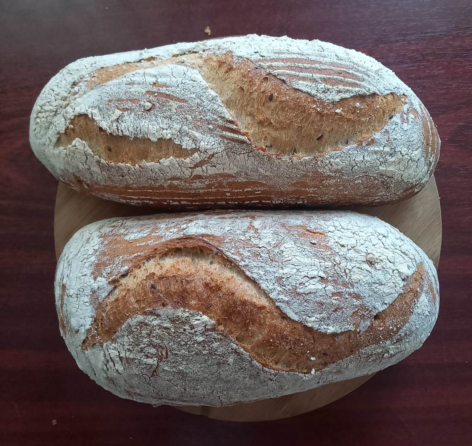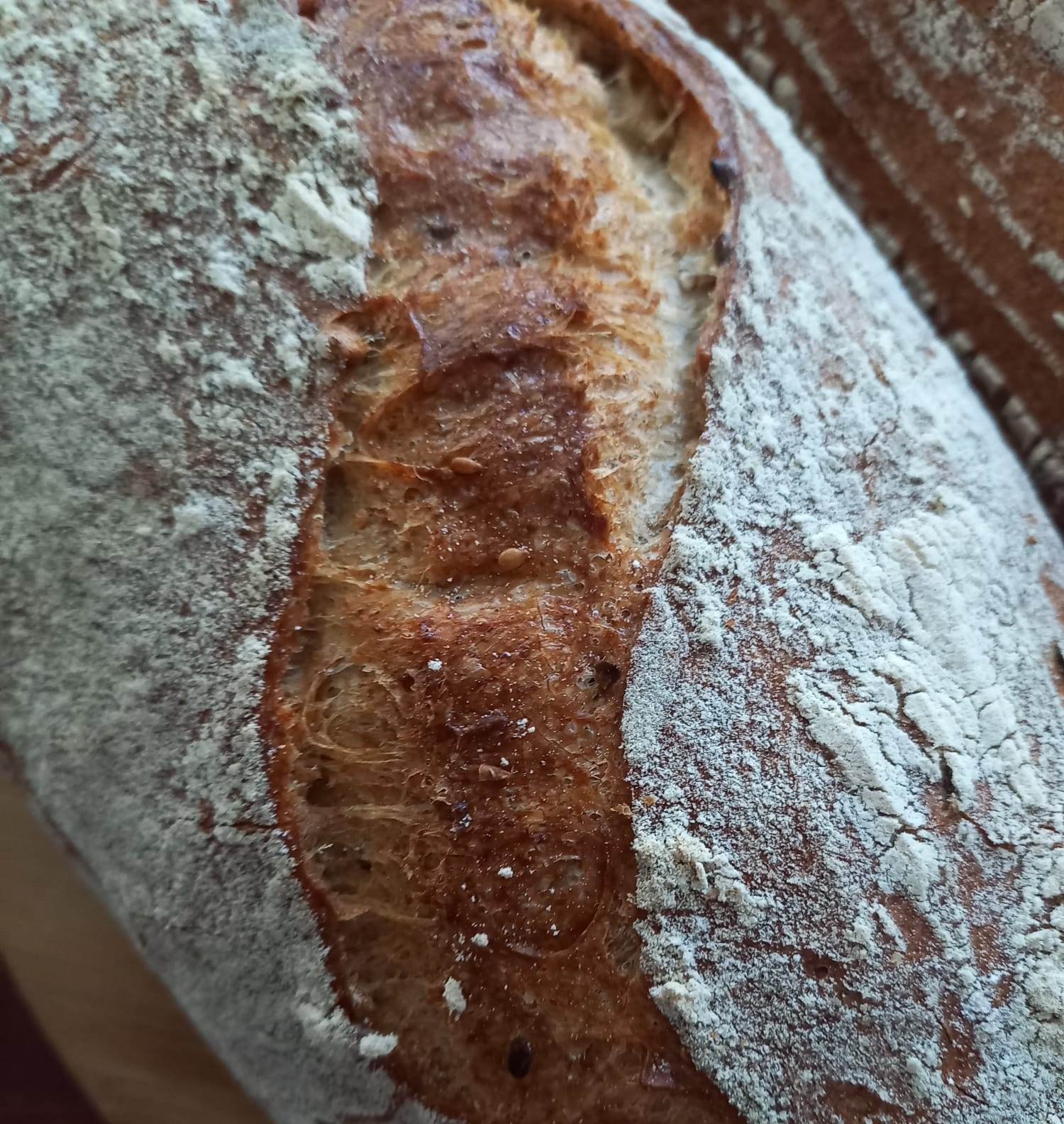Pâine integrală de grâu cu semințe 500 g cu maia naturală și făină măcinată la moara cu pietre combină tradiția fermentației lente cu beneficiile semințelor crocante. Fiecare pâine este dospită natural cu maia naturală din grâu (20%), pentru un gust autentic, miez moale și textură aerată.